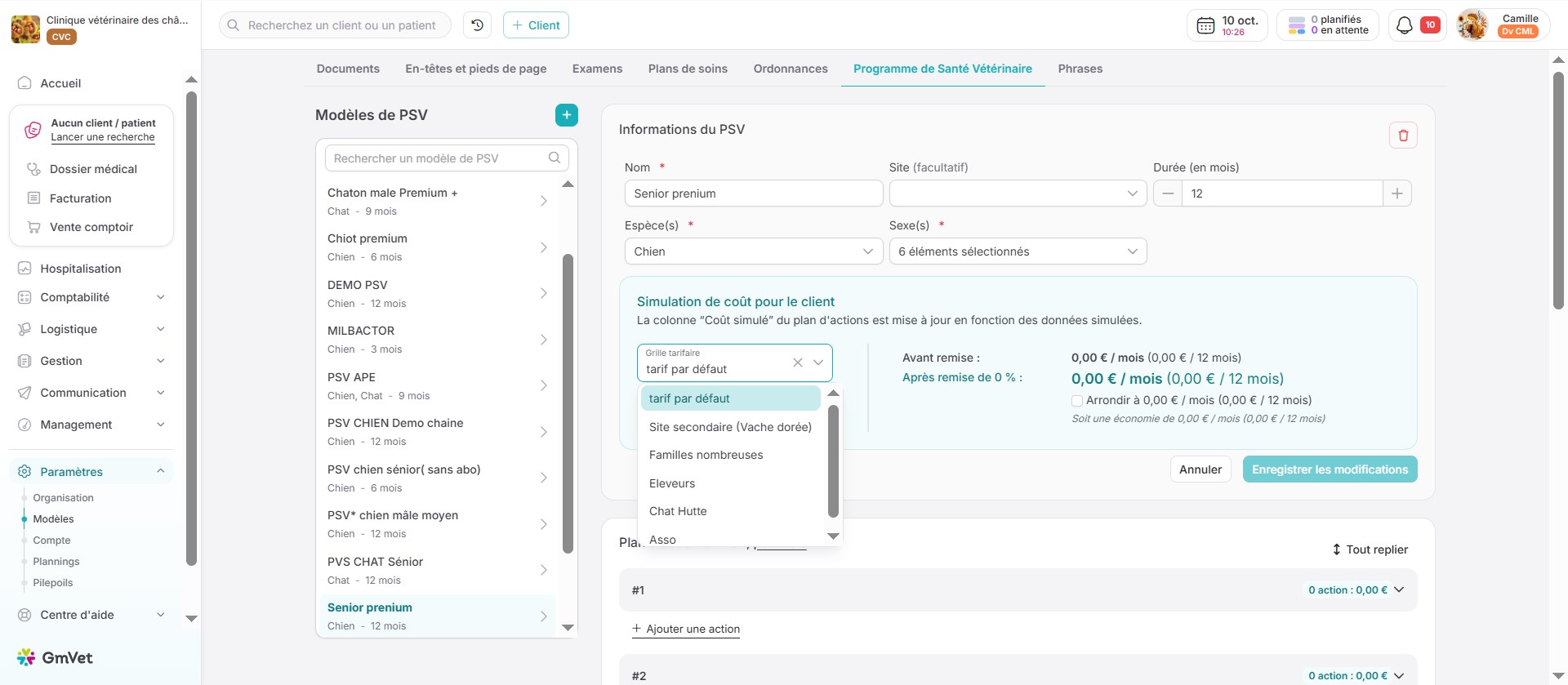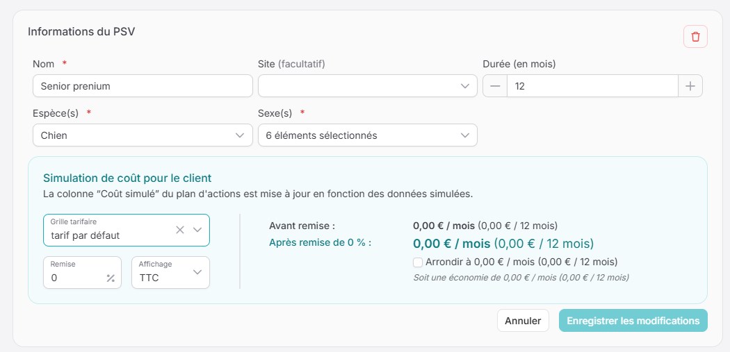 - Le tarif est propre au PSV, pas besoin de le créer dans la grille